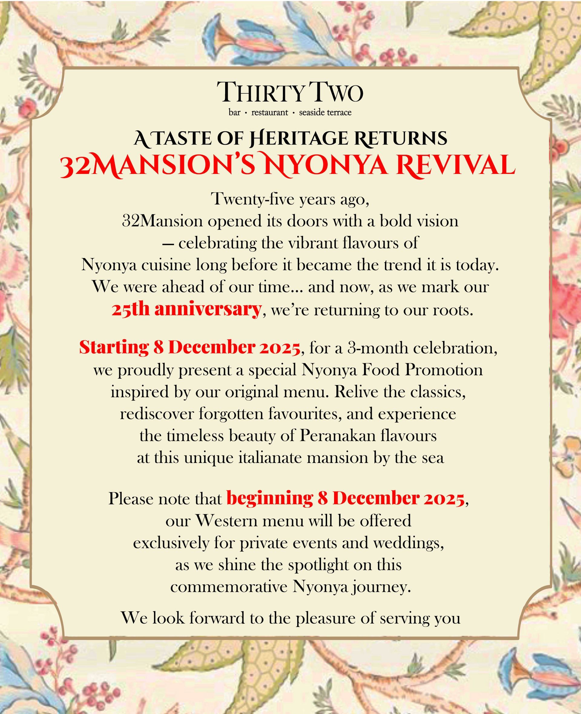 A LA CARTE PERANAKAN MENU IS SERVED FROM 11.30AM TO 3PM AND 6.30PM TO 9.30PM DAILY.